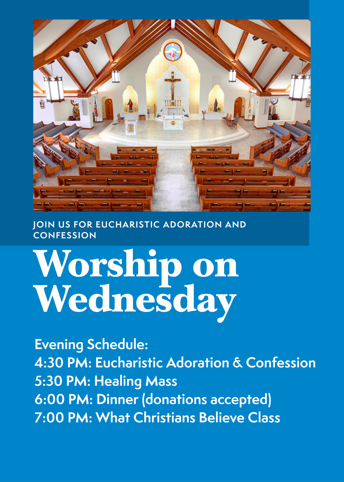 Each Wednesday at 4:30 PM, the Blessed Sacrament is exposed in the church for a time of quiet Eucharistic Adoration.